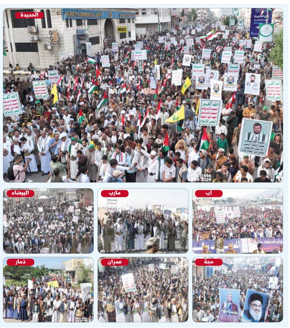 وندد بيان صادر عن المسيرات باستمرار الجرائم الوحشية التي يرتكبها كيان العدو الصهيوني بحق الأشقاء في غزة بالقتل والتدمير والتجويع والإبادة الجماعية والتهجير للشهر الـ 12 على التوالي، والتي امتدت إلى الضفة الغربية، وإلى لبنان مؤخراً بمشاركة ودعم أمريكي وبريطاني وغربي لا محدود، وتخاذل عربي غير مسبوق.