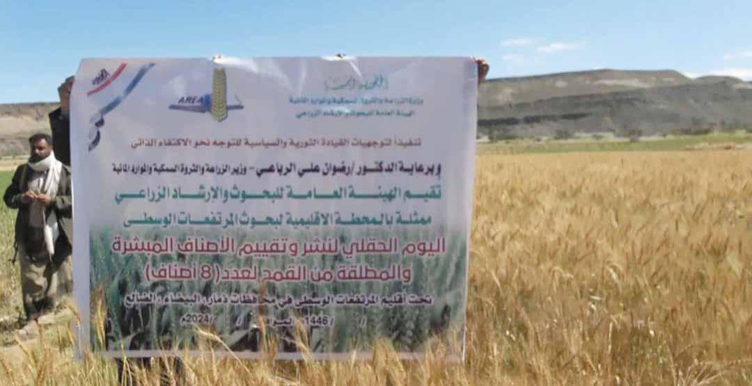 الدكتور عبدالالة مجلي- مدير عام محطة بحوث المرتفعات الوسطى : جاء التدشين اليوم تنفيذا لتوجيهات القيادة الثورية والسياسية بالتوسع في زراعة الحبوب بهدف الوصول إلى الاكتفاء الذاتي حيث تم زراعة 300 موقع قمح في حقول المزارعين بهدف نشر وتقييم أصناف القمح المحسنة وهي 8 أصناف تتميز بغلتها العالية ومقاومة الأمراض وملائمة البيئة المحلية في اقليم المرتفعات الوسطى والشمالية وأشار انه تم توزيع بذور الأصناف والسماد في ست مديريات موزعة على 40 موقعاً في مديرية الحدأ و40 موقعاً مديرية جهران و34 مديرية مكيراس و36 مديرية صباح 30 مديرية الطفة 120 مديرية دمت.. وسوف نشاهد نتائج مبهرة وكما لوحظ تفاعل المزارعين في المناطق المستهدفة الذين أبدوا حرصهم على الحصول على بذور الأصناف المزروعة ونتطلع إلى أن يكون المزارعون المشاركون نواةً لنشر تلك الأصناف لغيرهم من المزارعين في إطار المناطق المجاورة .