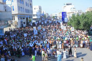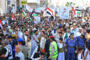 وفي المسيرات، التي تقدمها بمربع مدينة الحديدة وكيل اول المحافظة أحمد مهدي البشري، ووكلاء المحافظة بمختلف المديريات، رفع المشاركون العلمين اليمني والفلسطيني، ورايات الحرية والمقاومة، واللافتات المنددة بالعدوان الصهيوني الأمريكي على فلسطين واليمن، والمؤكدة على التحدي والصمود في وجه العدوان حتى تحقيق النصر.