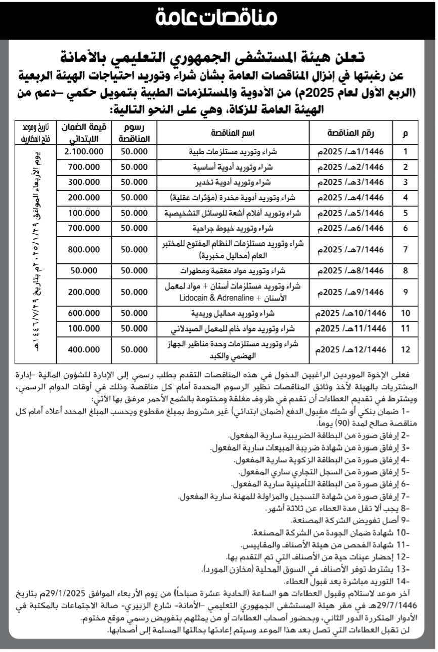 تعلن هيئة المستشفى الجمهوري التعليمي بالأمانة عن رغبتها في إنزال المناقصات العامةبشأن شراء وتوريد احتياجات الهيئة الربعية( الربع الأول لعام2025م) مناقصات On يناير 14, 2025 Share Share FacebookTwitterWhatsAppTelegramGoogle+البريد الإلكترونيPrint