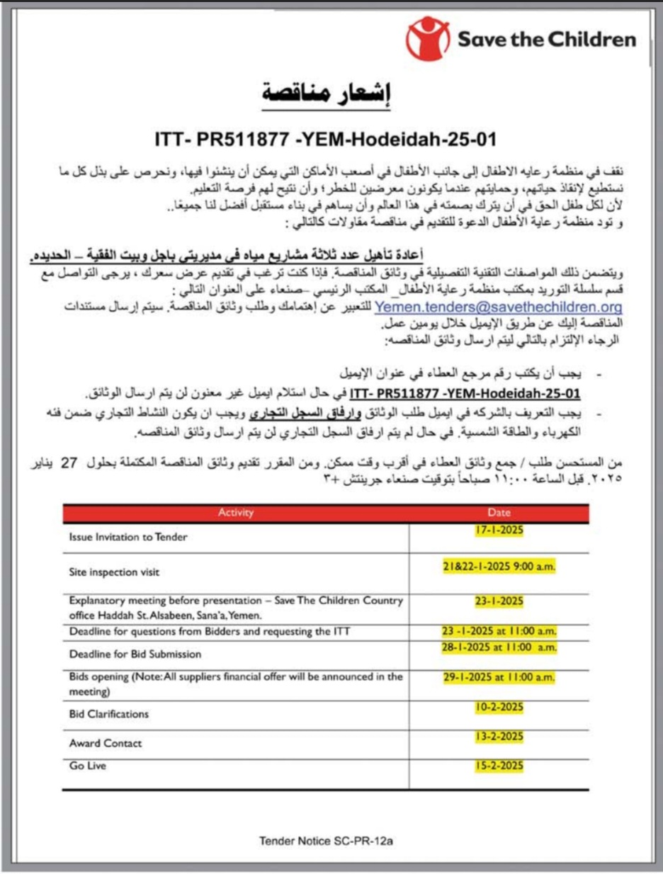 إعلان مناقصة من منظمة رعاية الأطفال لتأهيل مشاريع مياه بالحديدة مناقصات On يناير 19, 2025 Share Share FacebookTwitterWhatsAppTelegramGoogle+البريد الإلكترونيPrint