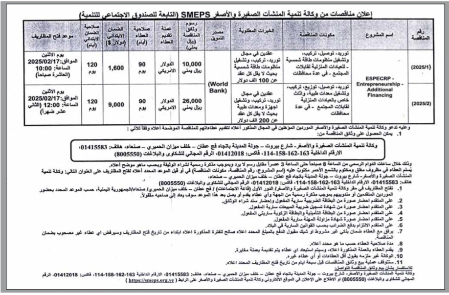 إعلان مناقصة من وكالة تنمية المنشآت الصغيرة والأصغر(smeps) مناقصات On يناير 22, 2025 Share Share FacebookTwitterWhatsAppTelegramGoogle+البريد الإلكترونيPrint