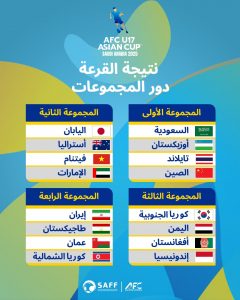 سحبت أمس، قرعة بطولة كأس آسيا للناشئين 2025م المقرر إقامتها بمدينتي جدة والطائف بالمملكة العربية السعودية خلال الفترة (3- 20) إبريل المقبل بمشاركة 16 منتخباً.