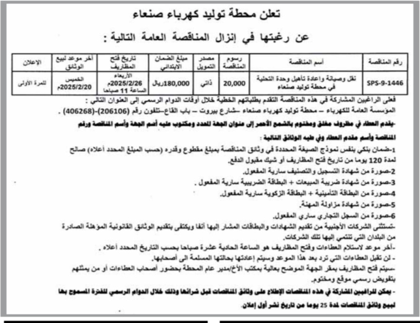 تعلن محطة توليد كهرباء صنعاء عن رغبتها في إنزال المناقصة العامة التالية مناقصات On يناير 30, 2025 Share Share FacebookTwitterWhatsAppTelegramGoogle+البريد الإلكترونيPrint