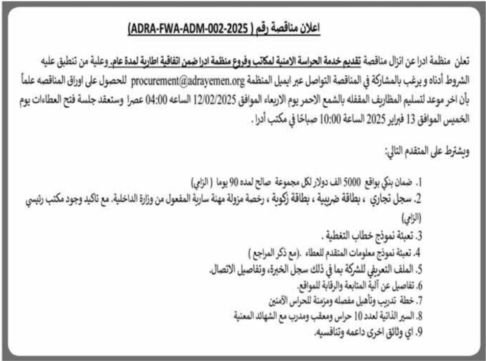 تعلن منظمة ادرا عن إنزال مناقصة تقديم خدمه الحراسة الأمنية لمكاتب وفروع منظمةادرا ضمن اتفاقية اطارية لمده عام مناقصات On يناير 31, 2025 Share Share FacebookTwitterWhatsAppTelegramGoogle+البريد الإلكترونيPrint