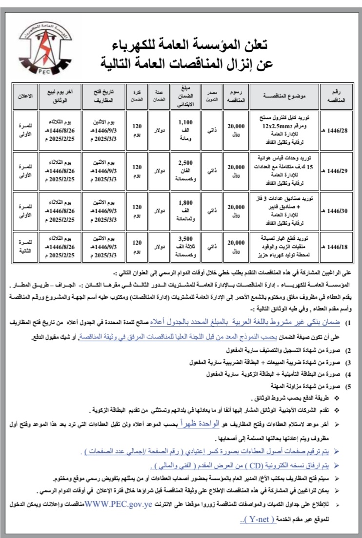 تعلن المؤسسه العامة للكهرباء عن إنزال المناقصات العامة التاليه مناقصات On فبراير 2, 2025 Share Share FacebookTwitterWhatsAppTelegramGoogle+البريد الإلكترونيPrint