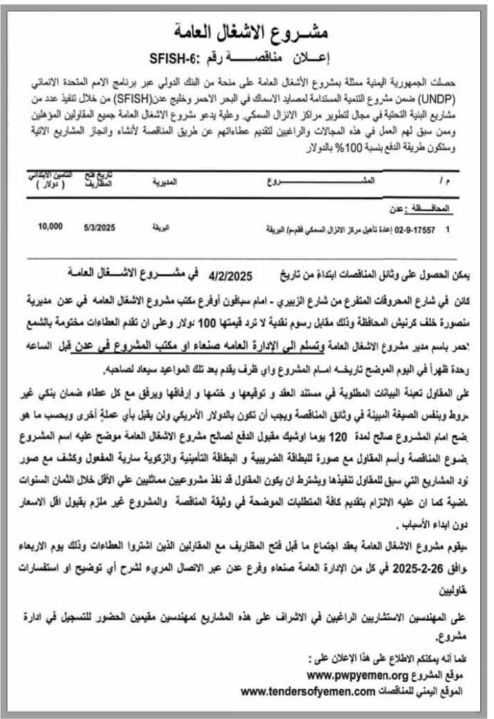 إعلان مناقصة _مشروع الأشغال العامة مناقصات On فبراير 2, 2025 Share Share FacebookTwitterWhatsAppTelegramGoogle+البريد الإلكترونيPrint