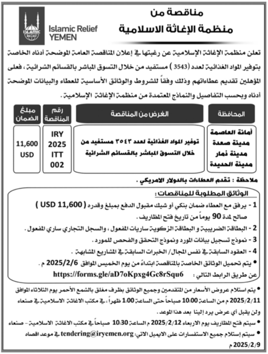 إعلان مناقصة منظمة الإغاثة الأسلامية مناقصات On فبراير 7, 2025 Share Share FacebookTwitterWhatsAppTelegramGoogle+البريد الإلكترونيPrint