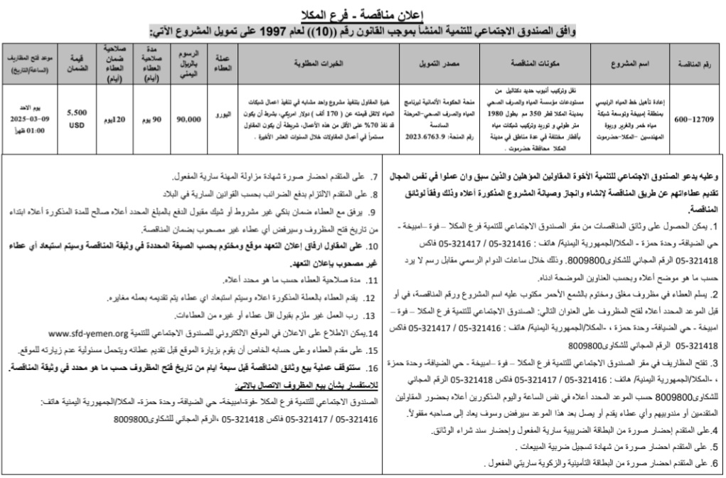 الصندوق الاجتماعي للتنمية فرع المكلا يعلن عن إنزال مناقصة عامة نقل وتركيب أنبوب حديد دكتاليل من مستودعات مؤسسة المياه والصرف الصحي + توريد وتركيب شبكات مياه بأقطار مختلفة - المكلا -حضرموت مناقصات On فبراير 11, 2025 Share Share FacebookTwitterWhatsAppTelegramGoogle+البريد الإلكترونيPrint
