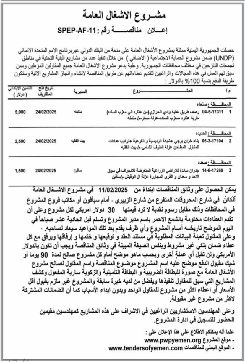 إعلان مناقصه مشروع الأشغال العامة مناقصات On فبراير 11, 2025 Share Share FacebookTwitterWhatsAppTelegramGoogle+البريد الإلكترونيPrint