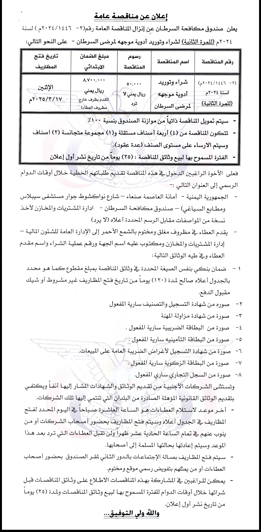 يعلن صندوق مكافحة السرطان عن إنزال المناقصه العامة رقم(2__/2025/1446)م لسنه 2025م( للمرة الثانية)لتوريد وشراء ادوية موجهه لمرضى السرطان_على النحو التالي مناقصات On فبراير 15, 2025 Share Share FacebookTwitterWhatsAppTelegramGoogle+البريد الإلكترونيPrint