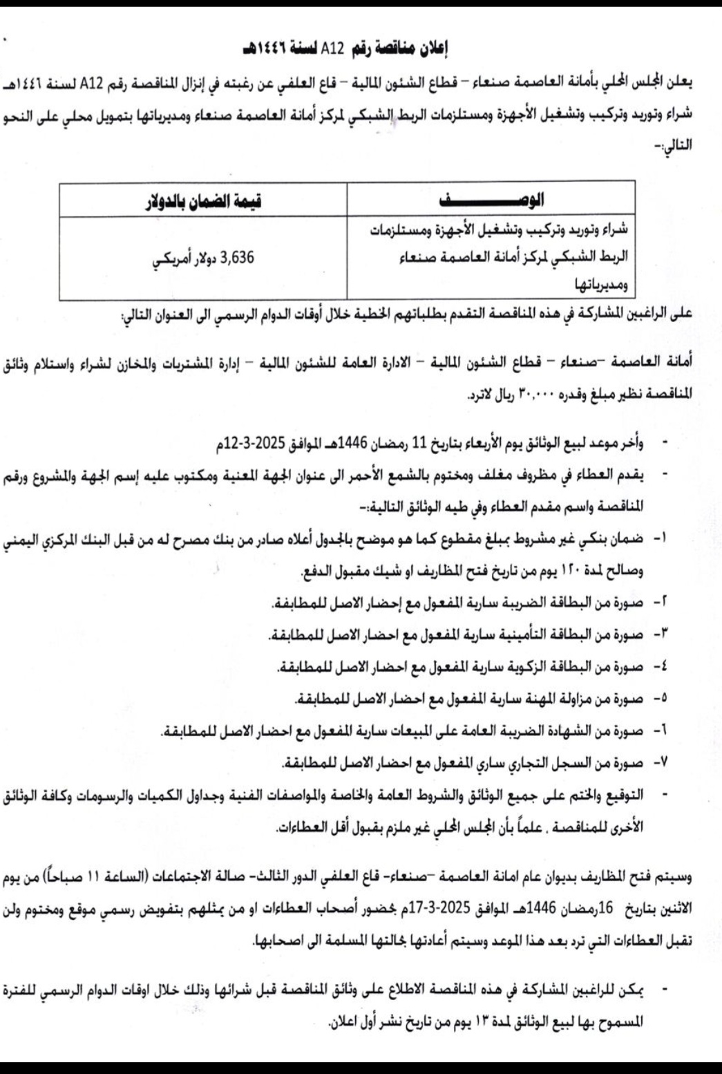 يعلن المجلس المحلي بأمانه العاصمة_قطاع الشئون المالية_ قاعة العلفي عن رغبتة في إنزال المناقصة التاليه مناقصات On فبراير 23, 2025 Share Share FacebookTwitterWhatsAppTelegramGoogle+البريد الإلكترونيPrint