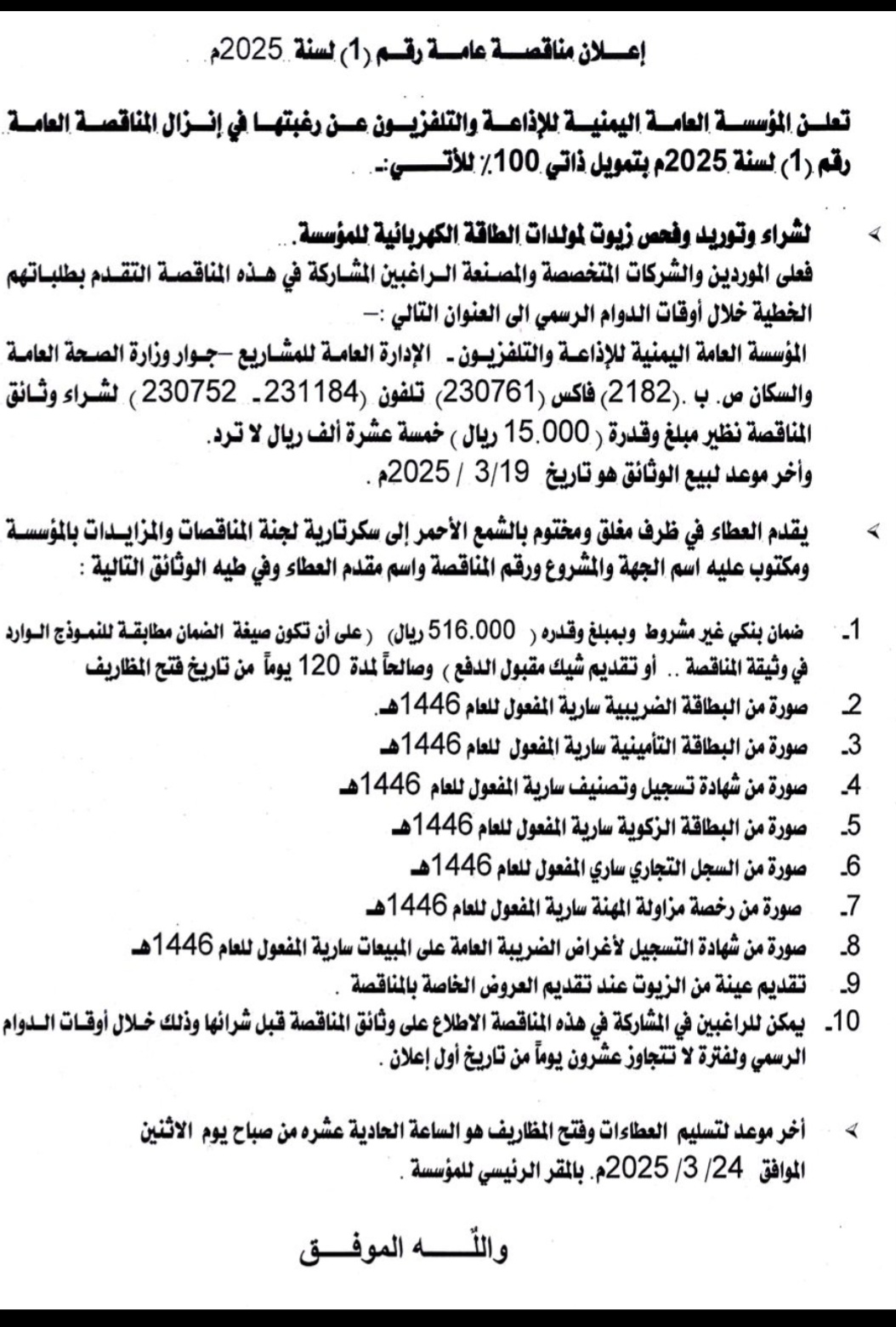 تعلن المؤسسة العامة اليمنية للأذاعة والتلفزيون عن رغبتها في إنزال المناقصة العامة رقم(1)لسنة2025م بتمويل ذاتي100% للأتي مناقصات On فبراير 24, 2025 Share Share FacebookTwitterWhatsAppTelegramGoogle+البريد الإلكترونيPrint