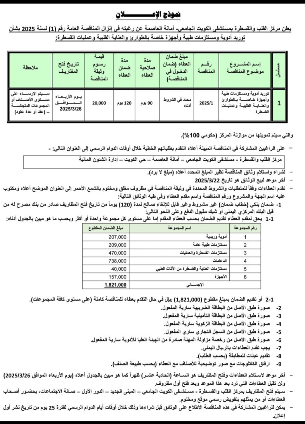 يعلن مركز القلب والقسطرة بمستشفى الكويت الجامعي_امانه العاصمة رغبتهافي إنزال المناقصة العامة رقم(1) لسنة 2025 مناقصات On فبراير 24, 2025 Share Share FacebookTwitterWhatsAppTelegramGoogle+البريد الإلكترونيPrint