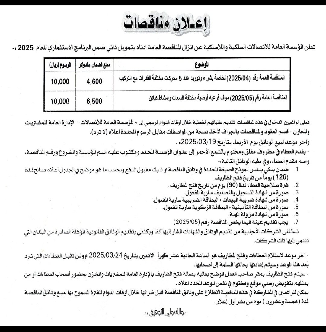 تعلن المؤسسة العامة للأتصالات السلكية واللاسلكيه عن إنزال المناقصة العامة ادناه بتمويل ذاتي ضمن البرنامج الاستثماري للعام 2025 مناقصات On فبراير 24, 2025 Share Share FacebookTwitterWhatsAppTelegramGoogle+البريد الإلكترونيPrint