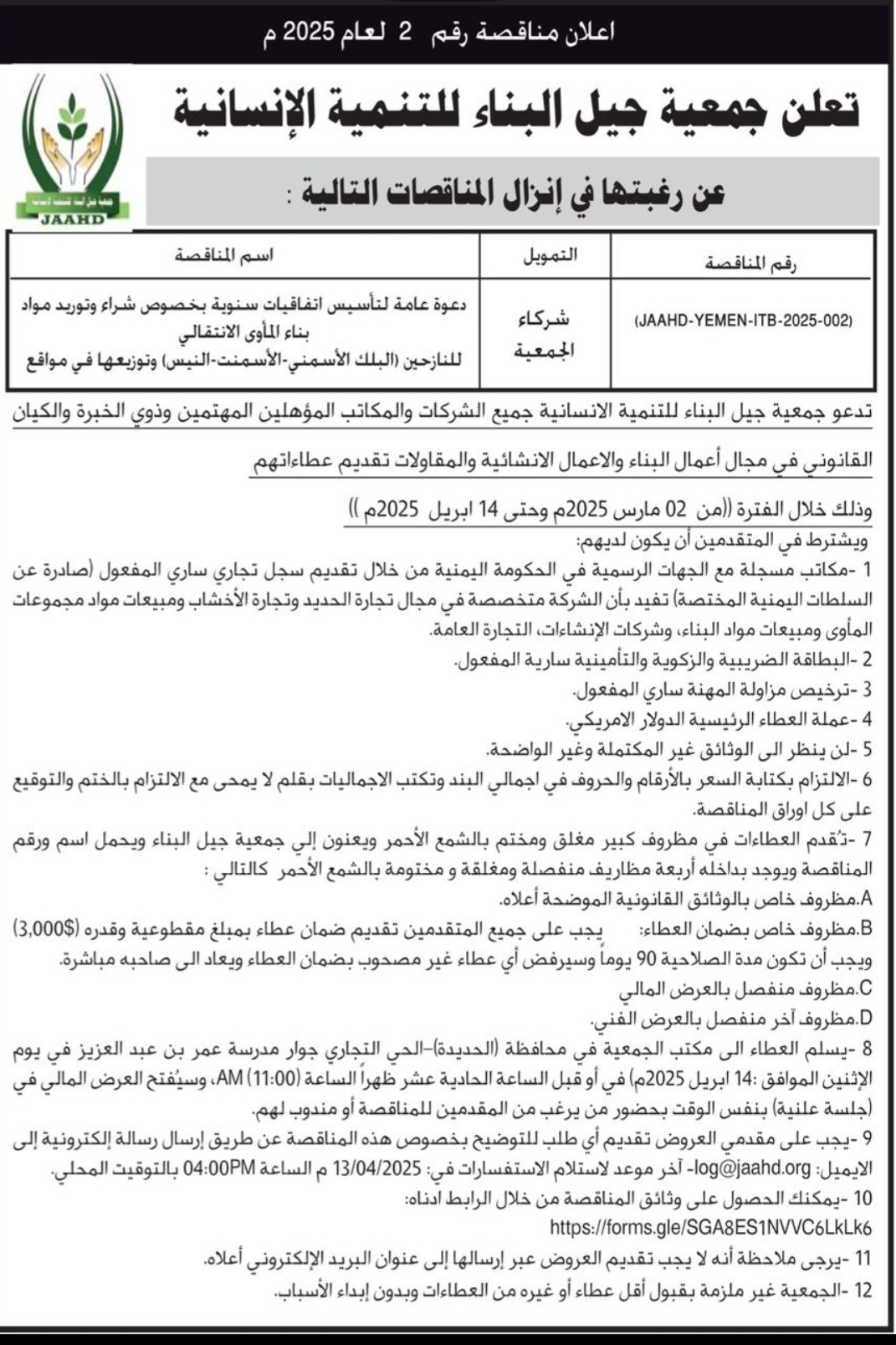 تعلن جمعية جيل البناء للتنمية الأنسانية عن رغبتها في إنزال المناقصات التالية مناقصات On مارس 4, 2025 Share Share FacebookTwitterWhatsAppTelegramGoogle+البريد الإلكترونيPrint