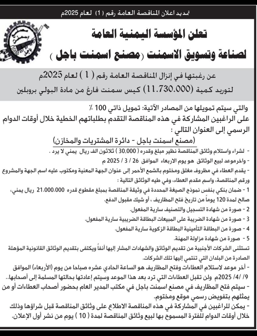 تعلن المؤسسة اليمنية العامة لصناعة وتسويق الأسمنت(مصنع اسمنت باجل) عن إنزال المناقصة العامة رقم(1)لعام 2025 مناقصات On مارس 11, 2025 Share Share FacebookTwitterWhatsAppTelegramGoogle+البريد الإلكترونيPrint