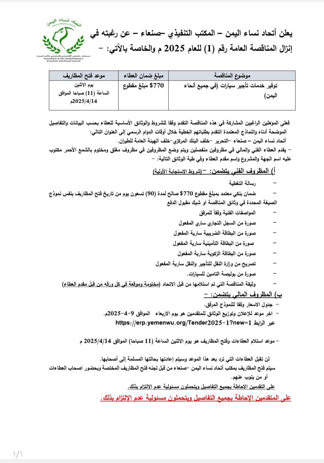 يعلن اتحاد نساء اليمن _المكتب _التنفيذي صنعاء عن رغبتة في إنزال المناقصة رقم(1 )للعام2025م والخاصة بالآتي- مناقصات On مارس 21, 2025 Share Share FacebookTwitterWhatsAppTelegramGoogle+البريد الإلكترونيPrint