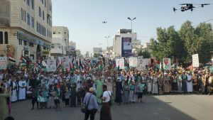 وخلال المسيرات التي شارك فيها وزير النقل والأشغال محمد عياش قحيم، ووكيل أول المحافظة أحمد مهدي البشري، إلى جانب عدد من وكلاء المحافظة. ردد المشاركون هتافات منددة بالعدوان الأمريكي على اليمن، ومستنكرة الجرائم الوحشية التي يرتكبها الاحتلال الصهيوني بحق الأبرياء في غزة على مدى أكثر من سبعة عشر شهرًا.