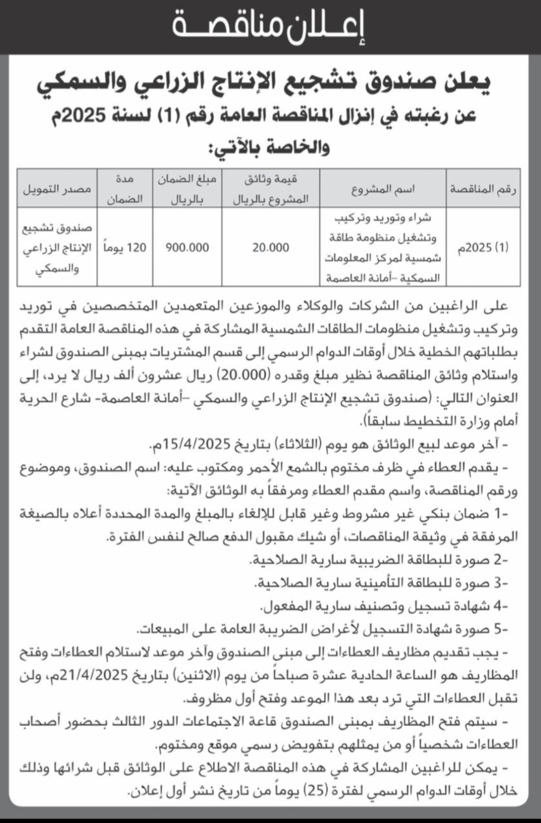 يعلن صندوق تشجيع الإنتاج الزراعي والسمكي عن رغبتة في إنزال المناقصة العامة رقم (1) لسنة 2025م الخاصة بالاتي: مناقصات On أبريل 11, 2025 Share Share FacebookTwitterWhatsAppTelegramGoogle+البريد الإلكترونيPrint
