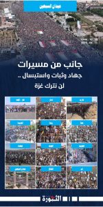 فيما شهدت محافظة الحديدة حشودا بشرية في 135 ساحة في مركز المحافظة والمديريات، جدد أبناء المحافظة من خلالها التضامن مع فلسطين، ومواصلة النفير في مواجهة العدو الأمريكي الصهيوني.
