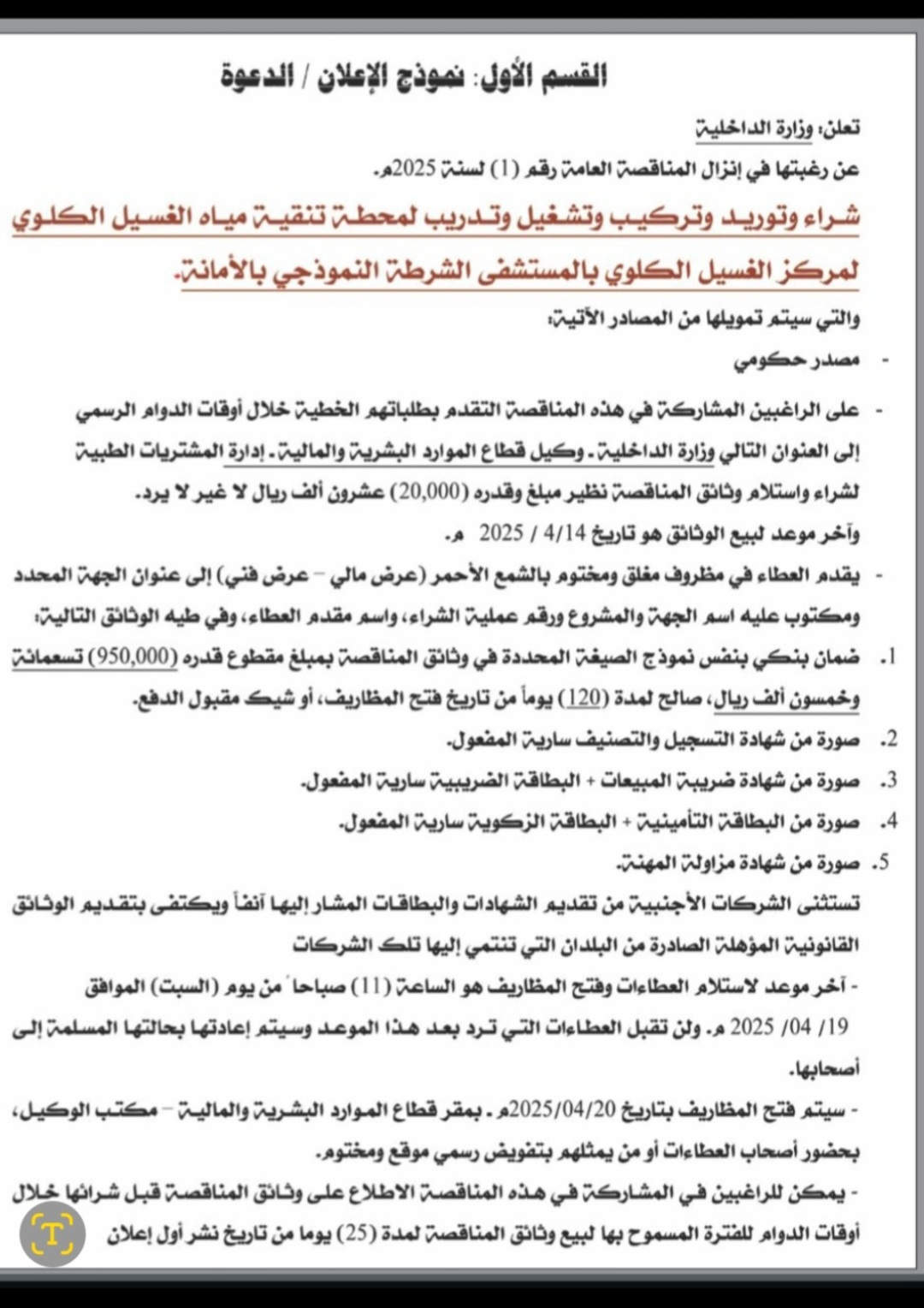تعلن وزارة الداخلية عن رغبتها في إنزال المناقصة العامة التالية رقم(1) لسنة 2025 م مناقصات On أبريل 12, 2025 Share Share FacebookTwitterWhatsAppTelegramGoogle+البريد الإلكترونيPrint
