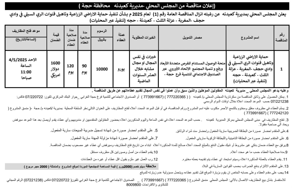 إعلان مناقصة من المجلس المحلي_مديريه كعيدنة محافظة حجة مناقصات On أبريل 12, 2025 Share Share FacebookTwitterWhatsAppTelegramGoogle+البريد الإلكترونيPrint