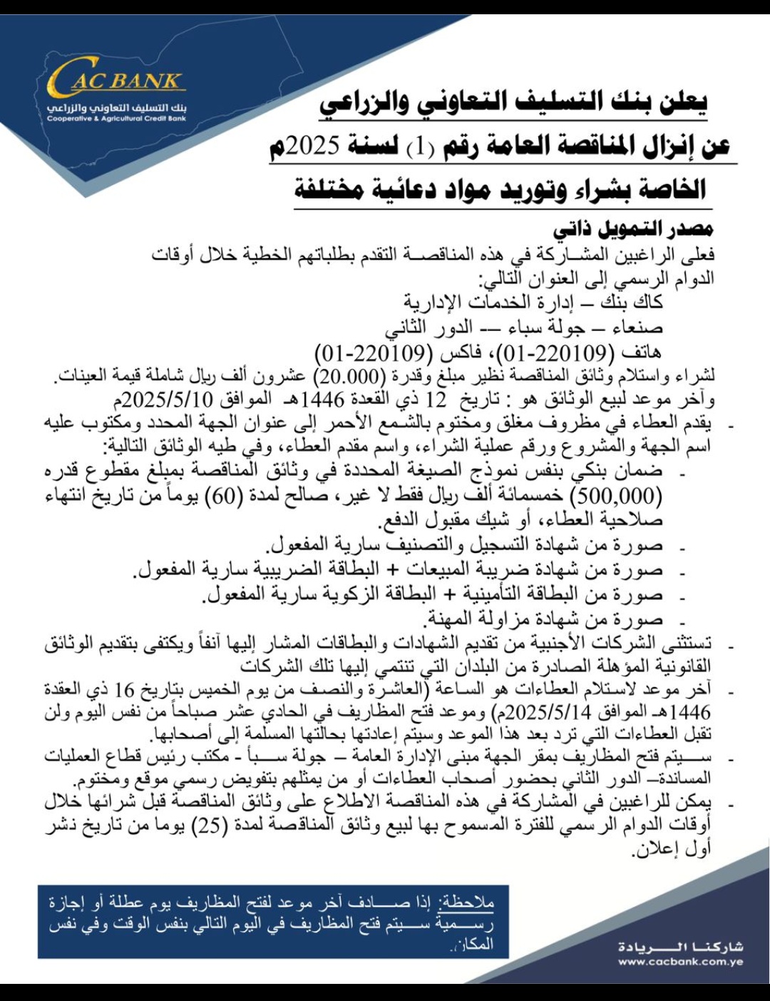 يعلن بنك التسليف التعاوني والزراعي عن إنزال المناقصة العامة رقم (1) لسنة 2025 م الخاصة بشراء وتوريد مواد دعائية مختلفه مناقصات On أبريل 14, 2025 Share Share FacebookTwitterWhatsAppTelegramGoogle+البريد الإلكترونيPrint