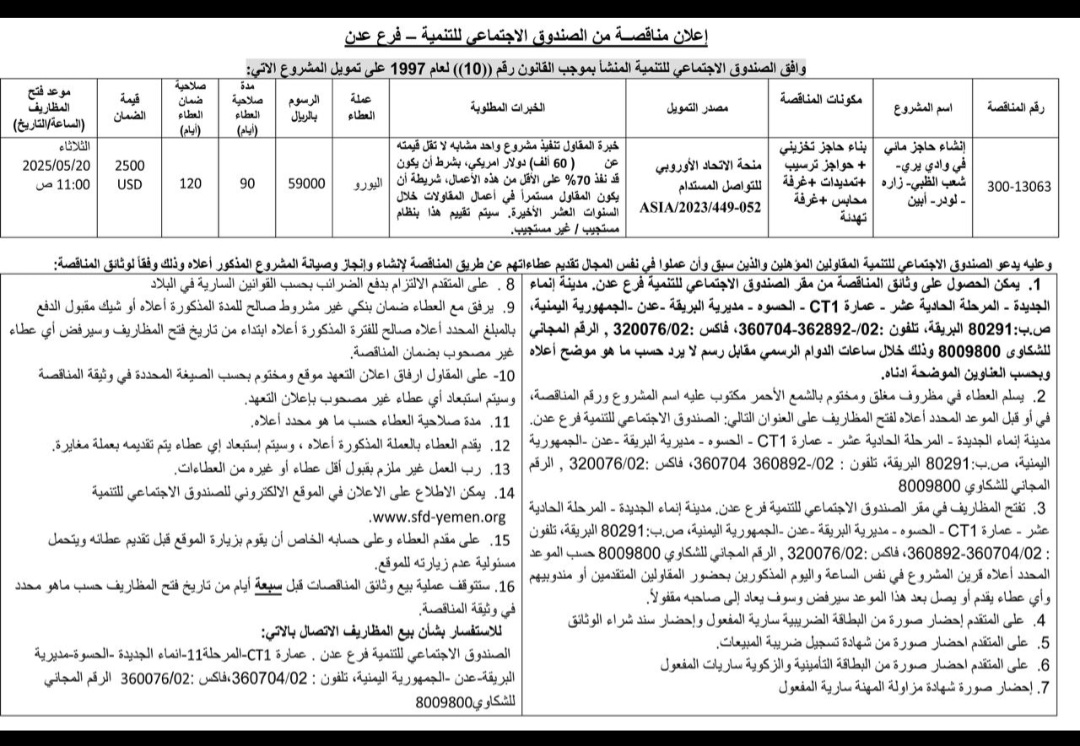 وافق الصندوق الأجتماعي للتنمية المنشأ بموجب القانون رقم(10) لعام1997 على تمويل المناقصة الاتية مناقصات On أبريل 21, 2025 Share Share FacebookTwitterWhatsAppTelegramGoogle+البريد الإلكترونيPrint