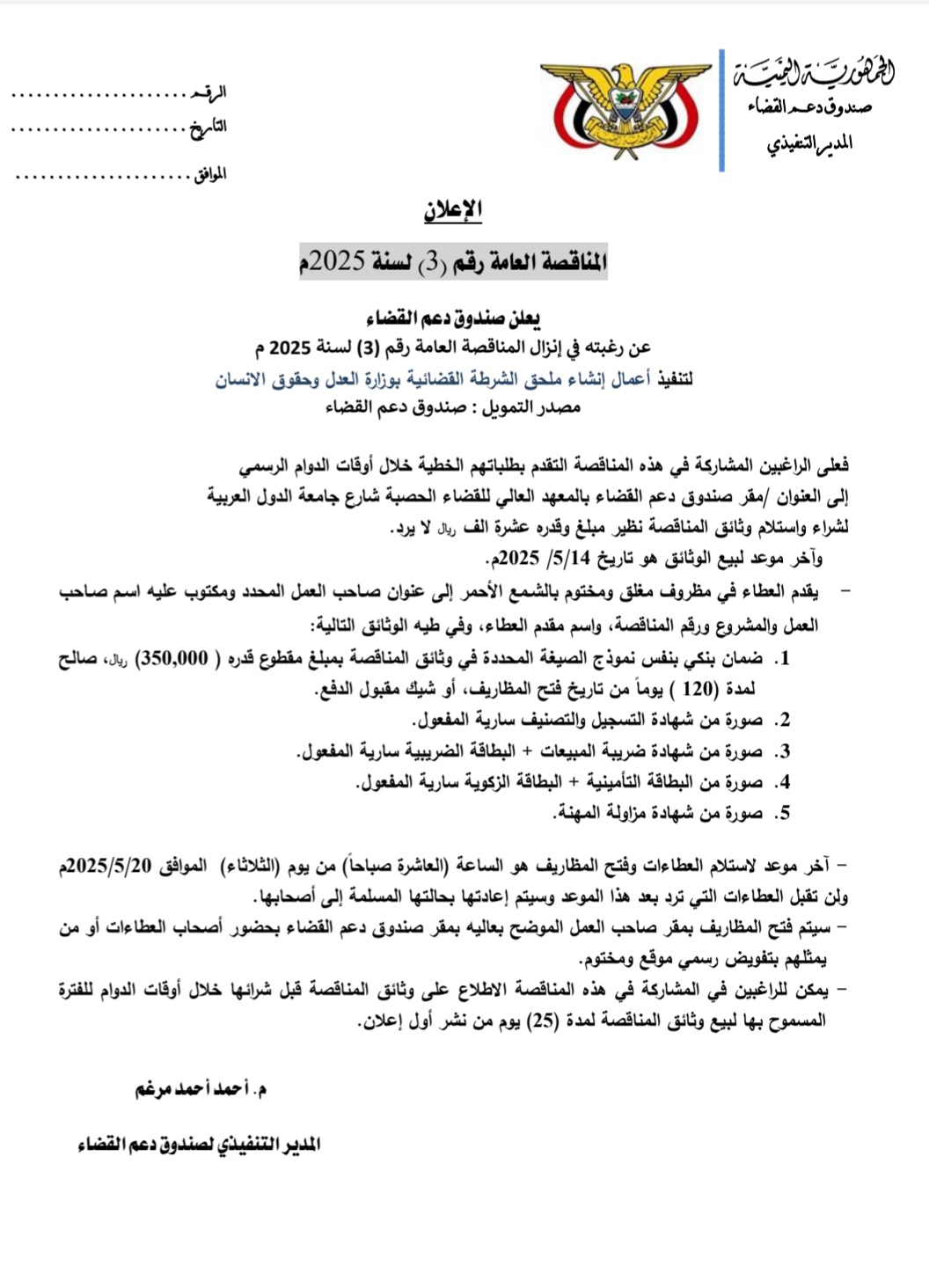 يعلن صندوق دعم القضاء عن إنزال المناقصة العامة رقم(3) لسنة2025 م مناقصات On أبريل 21, 2025 Share Share FacebookTwitterWhatsAppTelegramGoogle+البريد الإلكترونيPrint