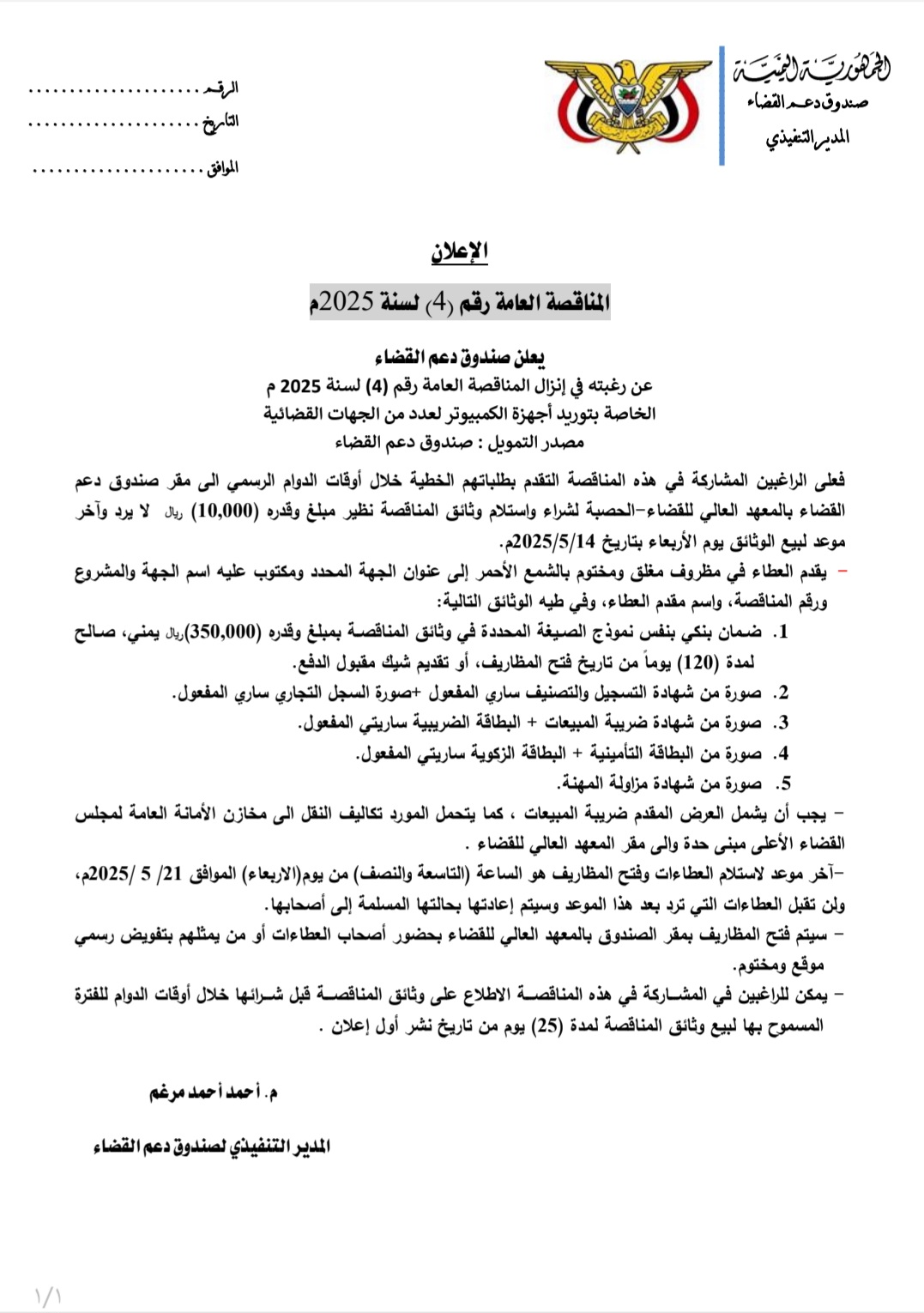 يعلن صندوق دعم القضاء عن إنزال المناقصة العامة رقم(4) لسنة2025 م مناقصات On أبريل 21, 2025 Share Share FacebookTwitterWhatsAppTelegramGoogle+البريد الإلكترونيPrint