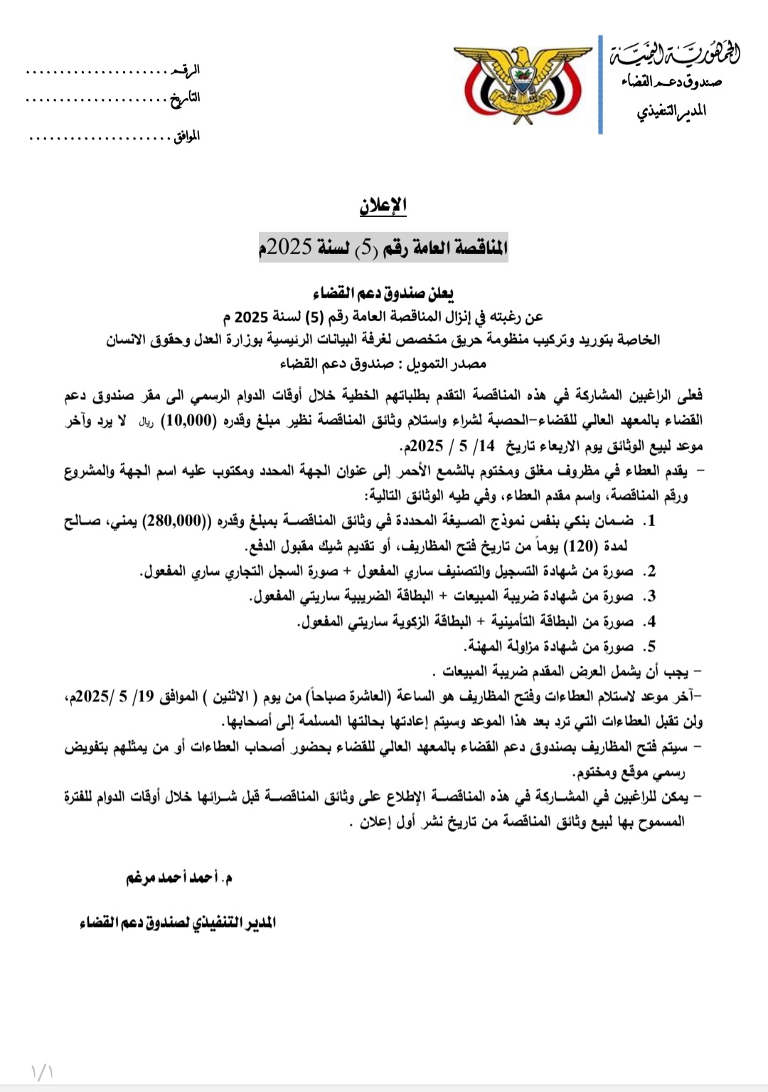 يعلن صندوق دعم القضاء عن إنزال المناقصة العامة رقم(5) لسنة2025 م مناقصات On أبريل 21, 2025 Share Share FacebookTwitterWhatsAppTelegramGoogle+البريد الإلكترونيPrint