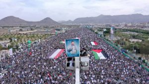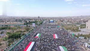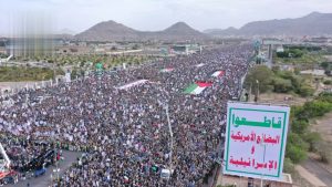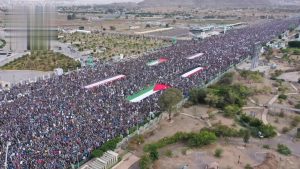 ورفعت الحشود المليونية في المسيرة، العلمين الفلسطيني واليمني، وشعارات الصرخة والجهاد والمقاومة، والمؤكدة على استمرار الصمود والثبات في مواجهة العدوان الأمريكي الصهيوني، وإسناد غزة حتى تحقيق النصر.