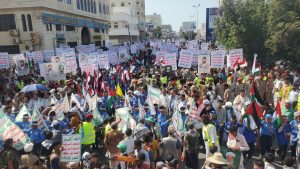 وعبر البيان الصادر عن المسيرات عن فخر أبناء الحديدة واليمن عموما بالضربات النوعية التي تنفذها القوات المسلحة اليمنية ضد مواقع العدو الصهيوني في عمق الأراضي المحتلة، وضد السفن العسكرية الأمريكية، مثل حاملة الطائرات “ترومان”، وذلك ضمن عمليات عسكرية ردعية انتصاراً لغزة.