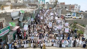 كما خرجت في مديرية القبيطة بمحافظة لحج مسيرة حاشدة تعبيرا عن الثبات والجاهزية في مواجهة العدو الأمريكي الصهيوني ومواصلة الوقوف إلى جانب الشعب الفلسطيني.