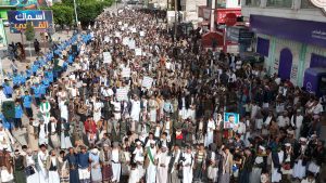 رفع المشاركون في المسيرات،الأعلام اليمنية والفلسطينية، ورايات الحرية المناهضة للسياسية الأمريكية في المنطقة،واللافتات المعبرة عن التضامن مع الشعب الفلسطيني،والمنددة بالعدوان والمجازر الصهيونية بحق أبناء غزة،،و تفويضهم للسيد القائد عبدالملك بدرالدين الحوثي..