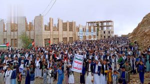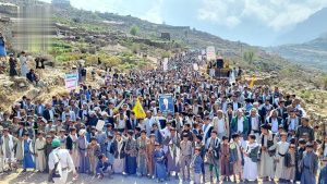 ورددت الجماهير المحتشدة، هتافات العزة والكرامة والحرية وشعارات البراءة من أعداء الإسلام “أمريكا وإسرائيل”، منددة بهرولة الأنظمة العربية المطبعّة وخضوعها للعدو الأمريكي.