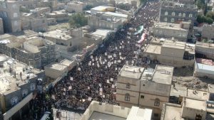 وردد المشاركون في المسيرات التي خرجت في الساحة المركزية بمدينة ذمار، ومدينة معبر بمديرية جهران، ومدينة ضوران، وساحات نويد، وحدقة، وعاثين، والوعري، وسنحان الغيل بقاع الحقل بمديرية ضوران، ومنطقة الدن، وسوق الإثنين بني الحداد، وساحة المخنق لقبائل القائمة وجعر، ويحضر بمخلاف الجبجب، والأثلوث بنقذ، ومغربة أصعر بمخلاف كبود بوصاب العالي، ومخلاف بني أسعد، ومدينة الشرق، ومركز جبل الشرق، وشرقي جبل الشرق، بمديرية جبل الشرق، وساحات سوق الأحد، وسوق مشرافة، والكمب بوصاب السافل، وساحة الثلوث لقبائل وصابين، ومركز مديرية عتمة، والميدان، وسوق الثلوث، والمقرانة، والربيعة بمديرية عتمة، ومركز مديرية المنار، ومخلاف المنار، والمعينة، والصافية بوادي كريفة، وبني سلامة بمديرية المنار، وساحتي زراجة وجبل الصهيد بالحداء، وساحات زُبيد وذخرة وبيت الضبياني بمديرية عنس، وساحة حصمان بمغرب عنس، وقرية الديلمي بميفعة عنس، هتافات العزة والكرامة والحرية وشعارات البراءة من أعداء الإسلام “أمريكا وإسرائيل”، منددة بهرولة الأنظمة العربية المطبعّة وخضوعها للعدو الأمريكي.