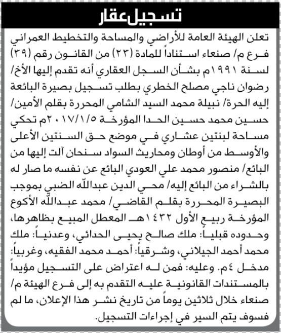 تعلن الهيئة العامة للأرضي فرع م/ صنعاء بأن الأخ / رضوان ناجي الخطري تقدم بطلب تسجيل بصيرة في السجل العقاري… إعلاناتمحاكم On مايو 22, 2025 Share Share FacebookTwitterWhatsAppTelegramGoogle+البريد الإلكترونيPrint