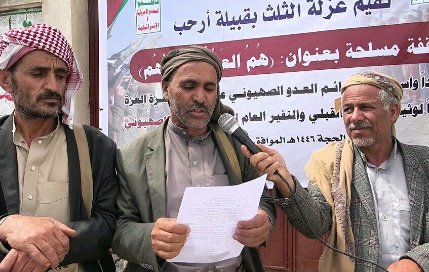 وفي مديرية أرحب نظم أبناء عزلة الثلث، وقفة قبلية مسلحة إعلانًا للنفير العام ودعمًا لغزة العزة وإعلانًا للبراءة من الخونة والعملاء.