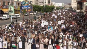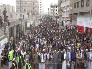 رفع المشاركون في المسيرات،الأعلام اليمنية والفلسطينية والإيرانية،ورايات الحرية المناهضة للسياسية الأمريكية في المنطقة،واللافتات المعبرة عن التضامن مع الشعب الفلسطيني،والمنددة بالعدوان والمجازر الصهيونية بحق أبناء غزة،و تفويضهم للسيد القائد عبدالملك بدرالدين الحوثي.