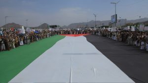 ورفعت الجماهير في المسيرة، الأعلام اليمنية والفلسطينية والإيرانية، تأكيداً على وحدة الموقف والقضية والمعركة في مواجهة أعداء الأمة الإسلامية “أمريكا وإسرائيل”.
