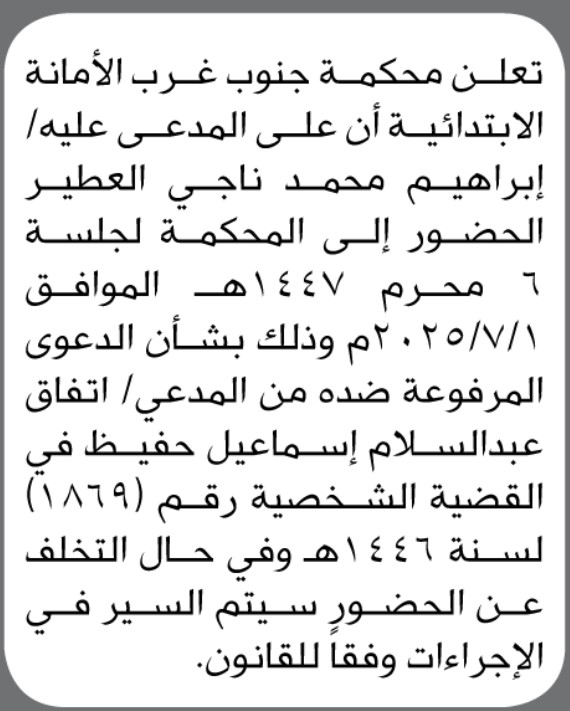 تعلن محكمة جنوب غرب الأمانة الإبتدائية أن على المدعى عليه إبراهيم محمد العطير الحضور إلى المحكمة إعلاناتمحاكم On يونيو 22, 2025 Share Share FacebookTwitterWhatsAppTelegramGoogle+البريد الإلكترونيPrint