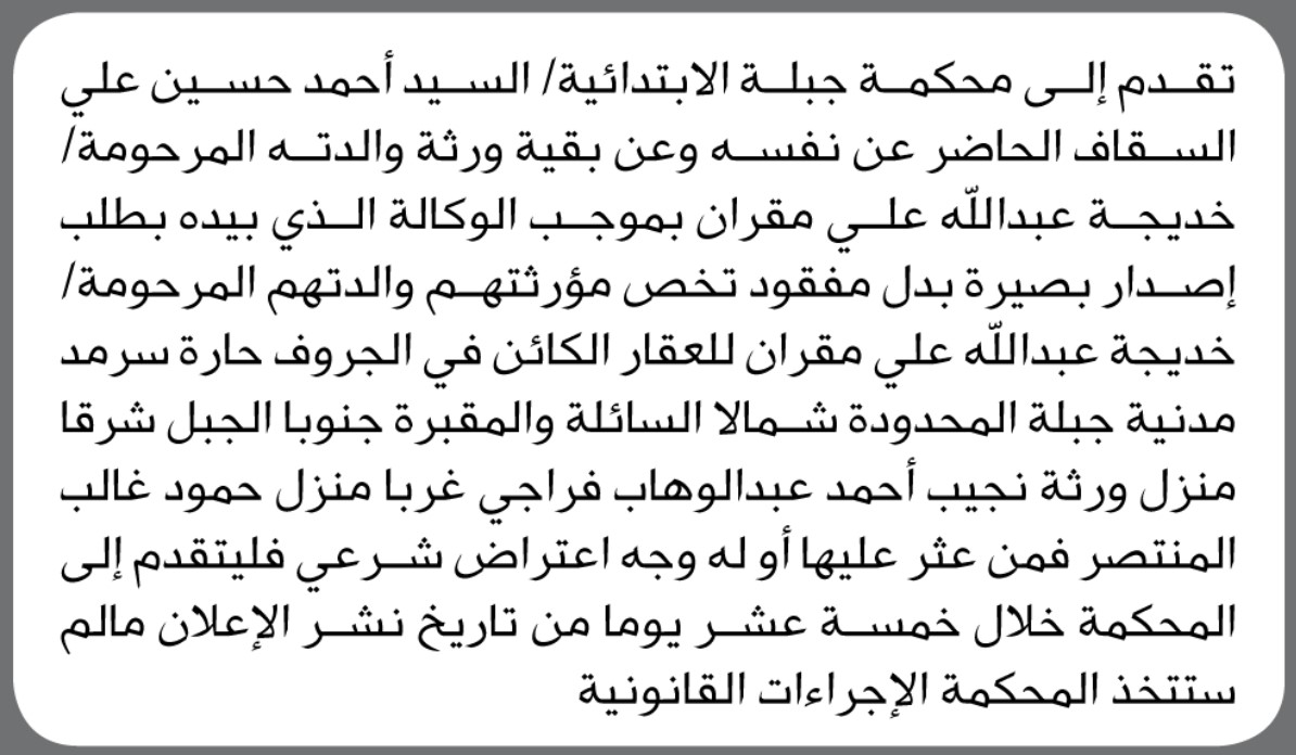 تقدم إلى محكمة جبلة الإبتدائية السيد أحمد حسين السقاف بطلب إصدار بصيرة إعلاناتمحاكم On يونيو 22, 2025 Share Share FacebookTwitterWhatsAppTelegramGoogle+البريد الإلكترونيPrint