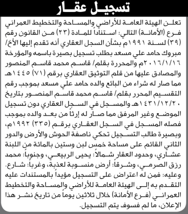 تعلن الهيئة العامة للأراضي فرع الأمانة أنه تقدم إليها الأخ مبروك حامد مسعد بطلب تسجيل بصيرة باسمه إعلاناتالسجل العقاري On يونيو 22, 2025 Share Share FacebookTwitterWhatsAppTelegramGoogle+البريد الإلكترونيPrint